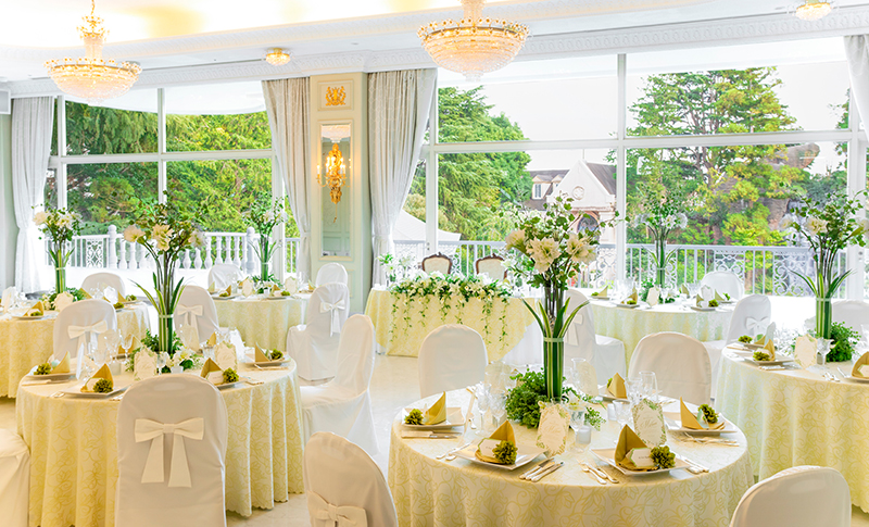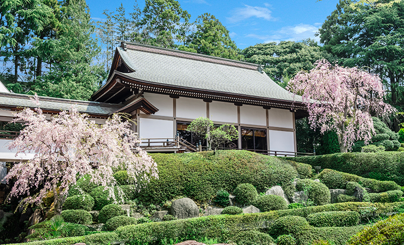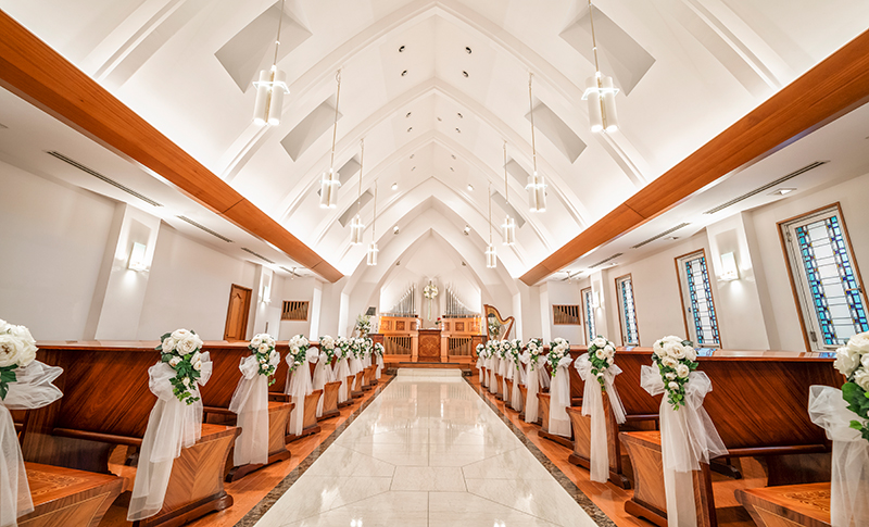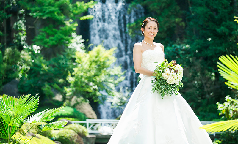 四季折々の美しさを見せる1500坪の緑豊かな日本庭園。大きな滝が流れる、その庭園の中に、人気の結婚式場「ロイヤルガーデンパレス 柏 日本閣」の独立型神殿とチャペルがあります。池のほとりに建ち、庭園を一望する『出雲大社千葉湖上殿』は、出雲大社の御分霊を祀る、都心近郊では希少な独立型神殿。伝統美にあふれ、響き渡る滝の水音と檜の香りに心安らぎます。荘厳な雅楽が奏でられ、凛とした空間に佇む羽織袴白無垢姿が清らかで印象的。緑に囲まれた『サン・ガブリエル教会』は、ヨーロピアンスタイルの清楚なチャペル。吹き抜けの天窓から自然の光が降りそそぐ明るい空間で、家族との絆を感じられる結婚式が叶います
