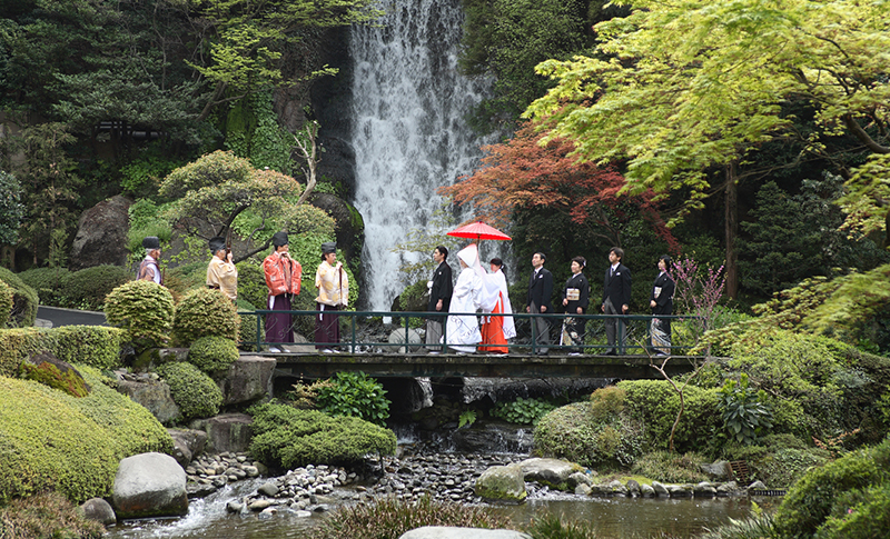 1500坪の日本庭園を誇る、千葉の老舗結婚式場「ロイヤルガーデンパレス 柏 日本閣」は、都心近郊とは思えない緑にあふれた式場です。季節ごとに表情を変える自然と、豊富な水が流れ落ちる大滝。風光明媚な庭園では、木々が風にそよぎ、鳥のさえずりが滝の音と共に聞こえてきます。雅楽の調べに包まれ、滝を背景に橋の上を白無垢の花嫁が進む『参進の儀』。その一行が進む先にあるのは、池のほとりに凛と佇む独立型神殿『出雲大社千葉湖上殿』です。まるで絵巻物のような美しい光景が、見守る人々を感動へと誘います。緑に囲まれた小高い丘には独立型のチャペルもあり、教会式での挙式も可能です